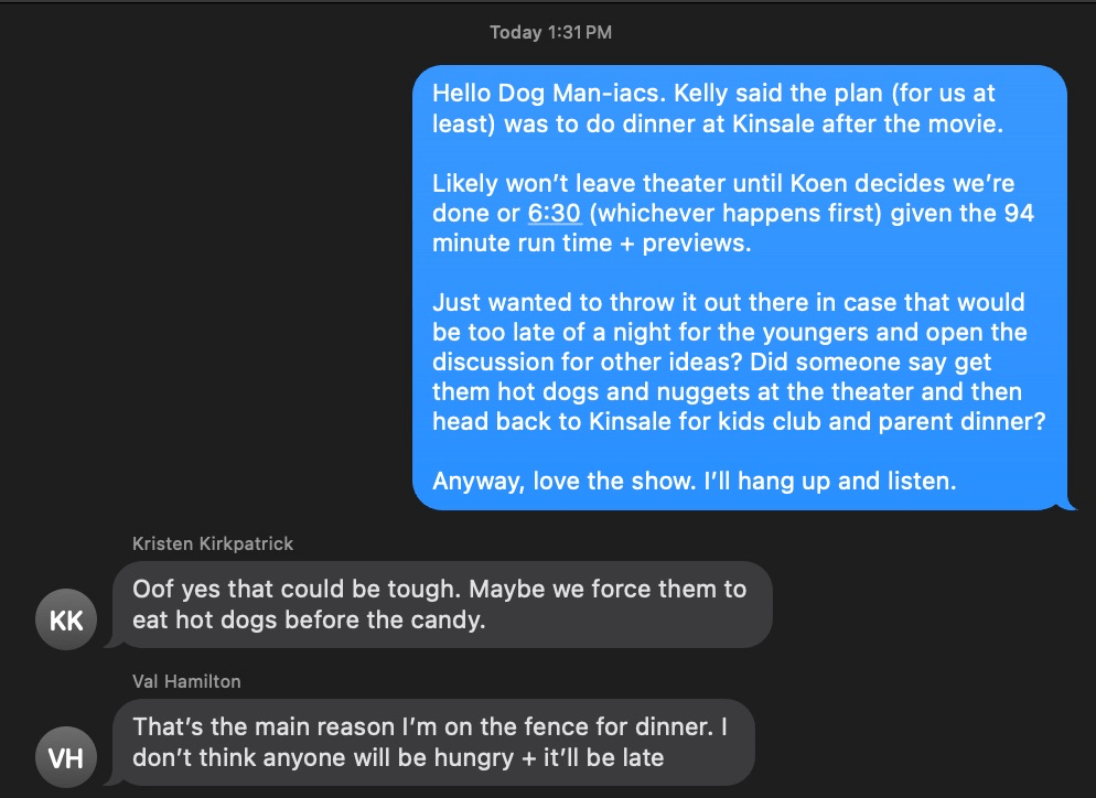 “Hey man. She’s not accounting for the previews. Even if you leave before the credits, you’re probably not going to get out of there until 6:30 and that puts us at Kinsale closer to 7. By the time we order, kids won’t be eating until 7:15 best case scenario. I don’t want to tell her, so just thought I’d let you know and do with that what you will. Also, let’s do lunch sometime.”
