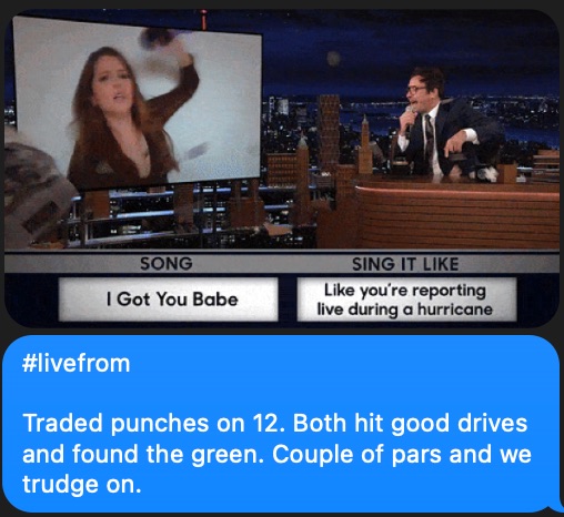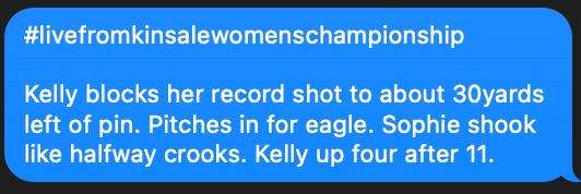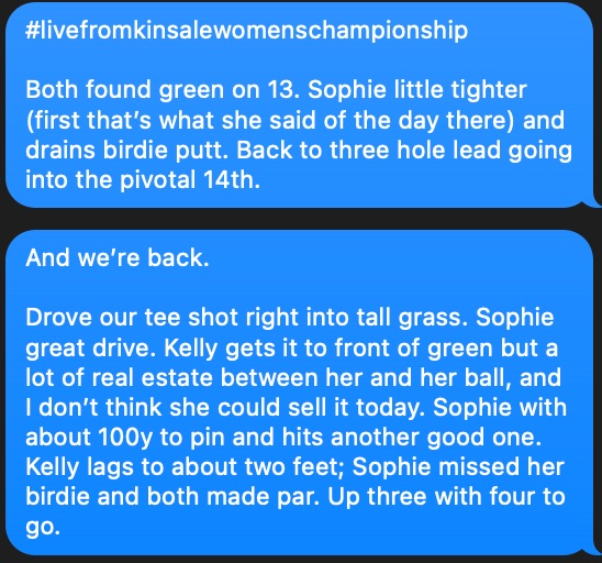 Now, I’m going to copy/paste the “live correspondence” that I was texting our group chat. For whatever reason, everyone had plans on the day your mom had her club championship, so I felt like I needed to keep the people informed.