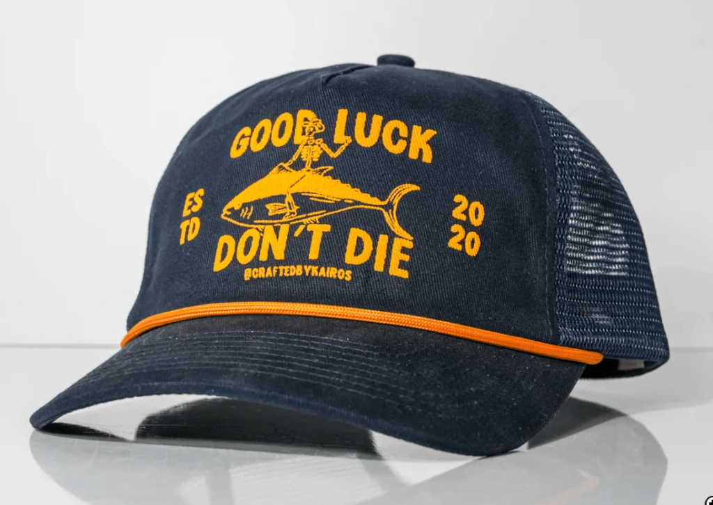 Another good hat with a lot to say and, at the end of the day, isn’t that everything we want in a hat? It’s got a touch of the supernatural (isn’t that luck, after all?), adventure (what’s he doing where dying is even on the table?), and there is a skeleton in a cowboy hat riding what looks like a giant tuna. The cowboy hat says that it plays in Nashville, too, so it’s got that going for it, which is nice.